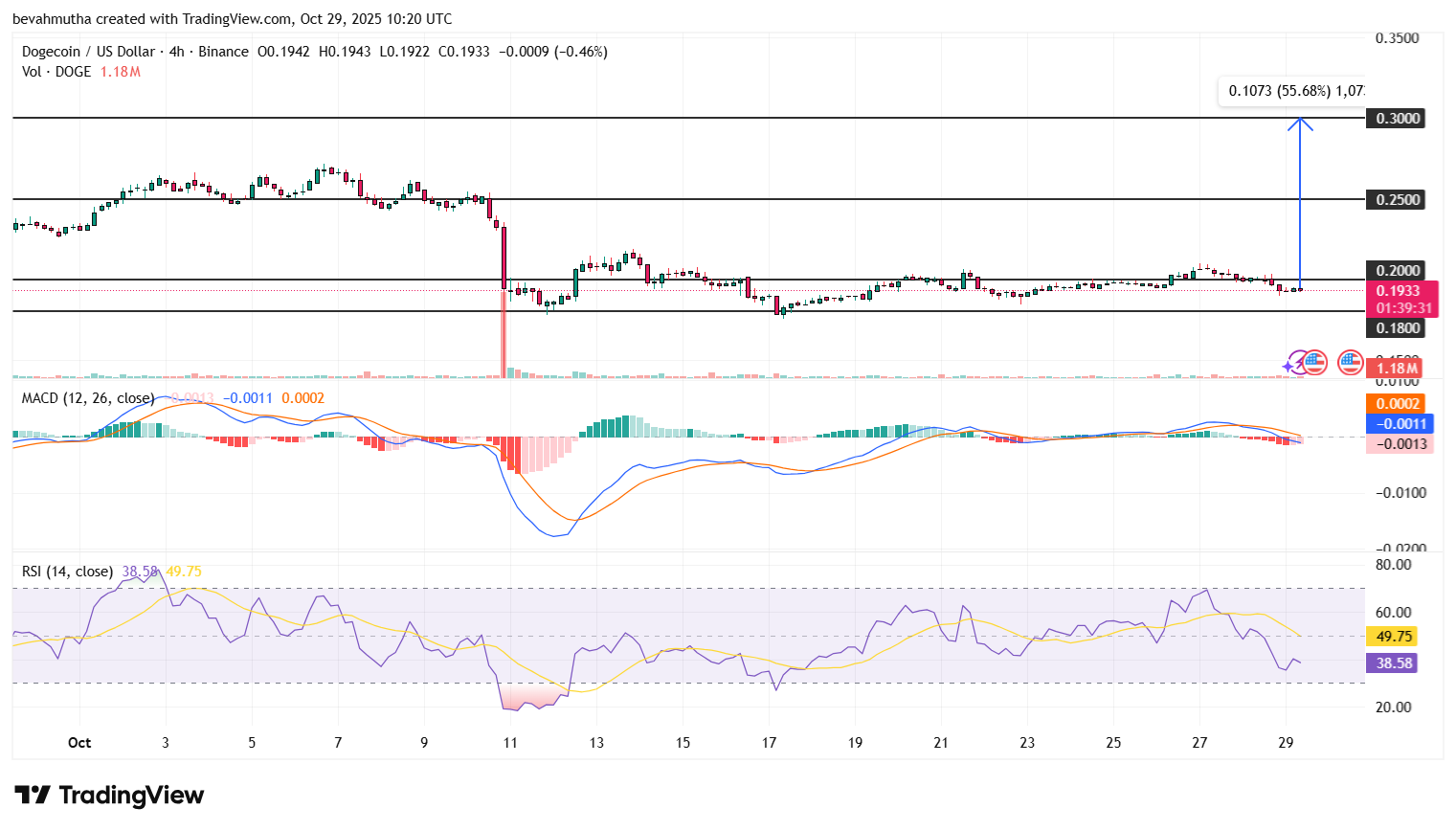 截至撰稿时,DOGE价格交易于0.193美元附近,过去24小时微跌0.62%显示短期疲软。图表显示DOGE继续在0.18至0.20美元窄幅区间内整理,表明交易者处于观望状态。