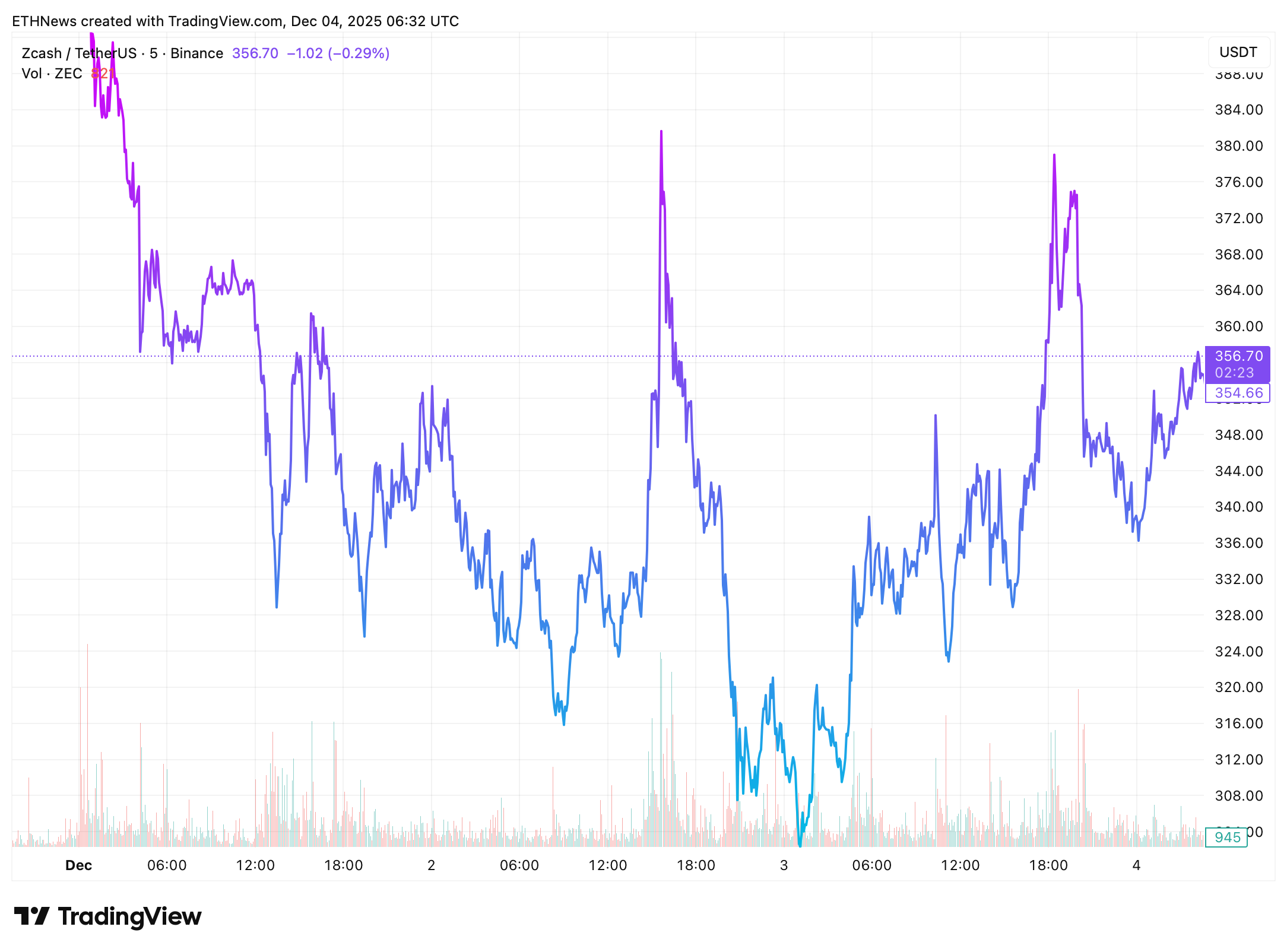 Zcash (ZEC) 在经历了12月初的急剧下跌后正试图企稳,目前价格走势在关键的350至360美元区间附近震荡。图表显示,ZEC已从11月的高点大幅回撤,在一系列更低的低点之后形成了圆弧底结构。日内反弹期间成交量开始小幅上升,暗示需求正初步回归。