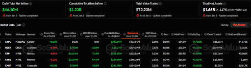 截至1月5日,SoSoValue的更新显示,所有已上市的XRP ETF总净流入达到4610万美元。市场累计净流入为12.3亿美元。XRP ETF的总净资产达到16.5亿美元,占XRP总市值的1.17%。当日总交易额为7223万美元。