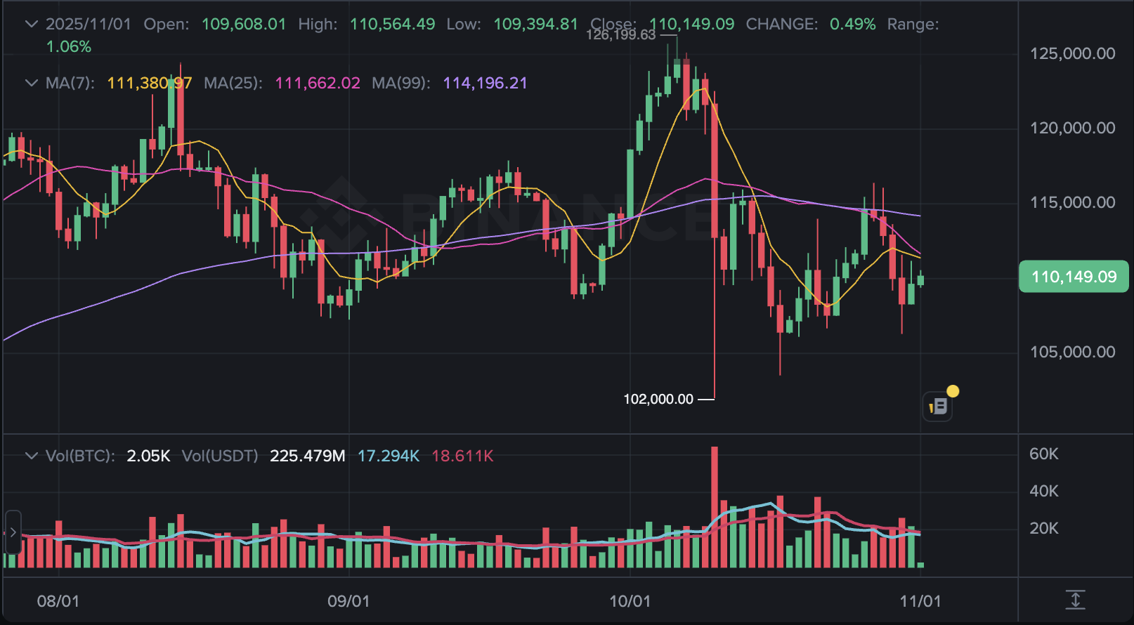 十月期间,比特币经历了一段起伏不定的走势,先是短暂下探至10.6万美元,次日又反弹至10.96万美元。这种波动在投资者中引发了谨慎乐观情绪——此前令人失望的"上涨十月"过后,市场正为历史上表现更强劲的十一月做准备。美联储对降息持谨慎态度,加上美中贸易紧张局势再度升温,放大了短期抛售压力。