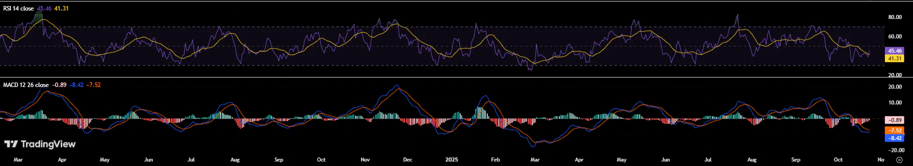RSI(相对强弱指数)和MACD(异同移动平均线)等指标进一步强化了这种预期。当前RSI位于45附近,表明资产在进入超买区间前仍有充足上行空间。而MACD线在长期看跌后开始收敛,这是看涨动能增强的典型信号。