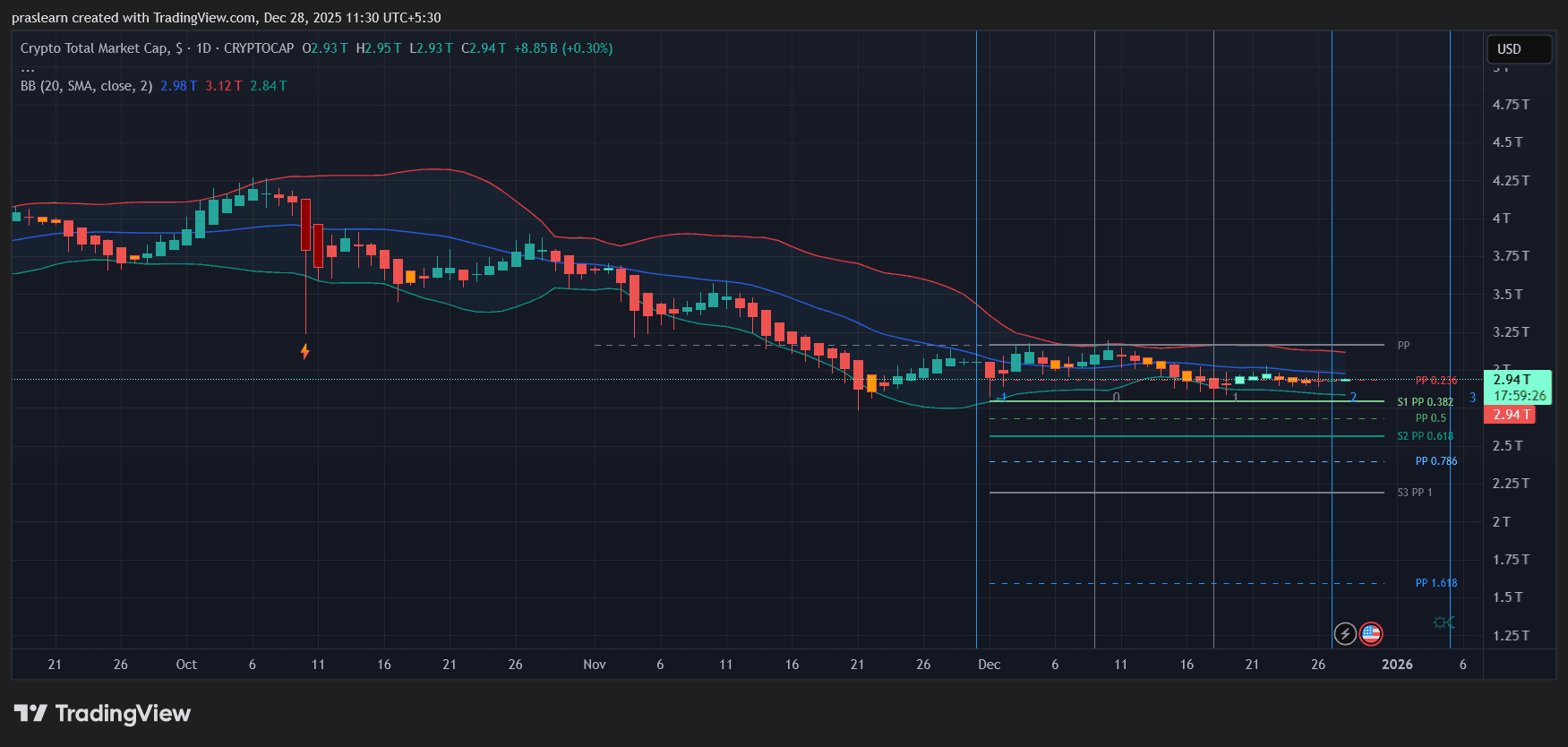 动量指标显示卖压正在减弱,但尚未确认趋势反转。自12月初以来,市场多次尝试突破中轨阻力未果,表明市场信心逐渐消退。若美联储释放提前降息或更宽松的政策信号,突破3.0-3.1万亿美元关口可能引发新一轮牛市,目标看向3.25-3.5万亿美元区间。反之若鹰派言论重现,市场或再次下探2.8万亿美元支撑,进而向2.5万亿美元(0.618斐波那契回撤位)深水区寻找流动性。