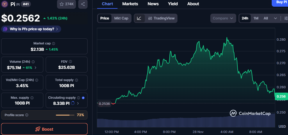 Pi币价格随TPS性能提升同步走高。过去24小时内,Pi币价格上涨1.43%,现报约0.2562美元。虽然涨幅温和,但显示出市场信心与用户活跃度的提升。当前Pi币市值达21.3亿美元,反映出随着网络发展其价值的持续增长。
