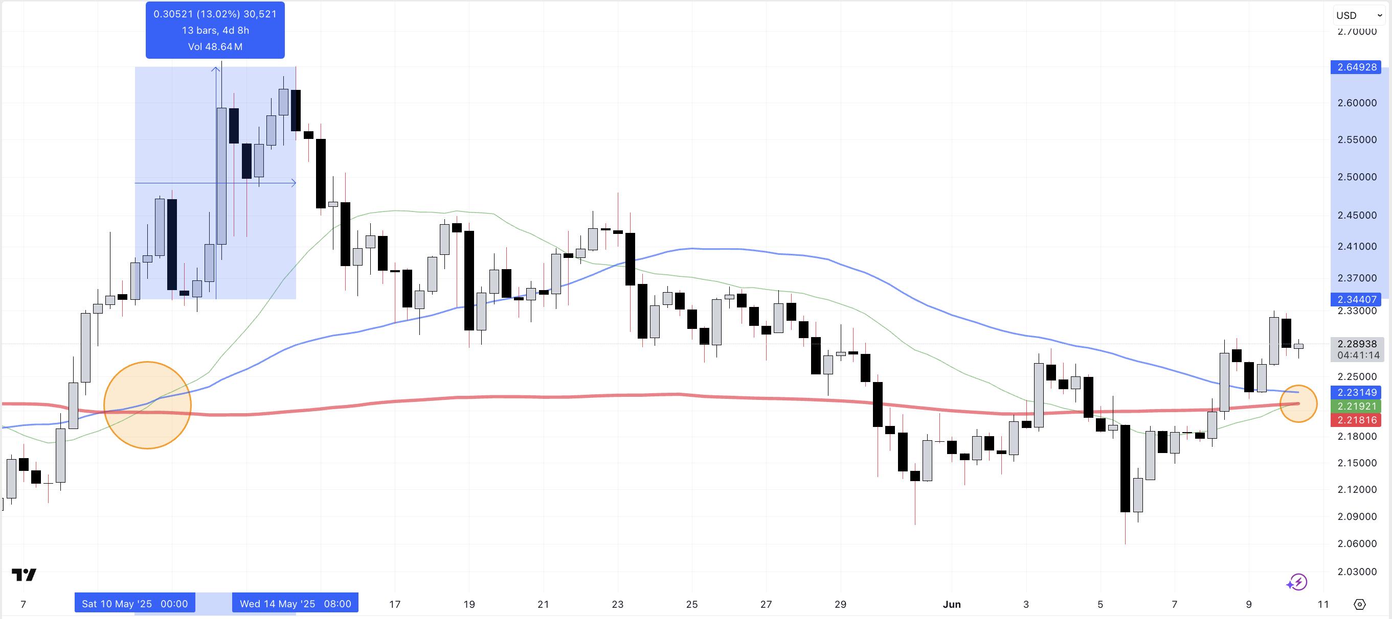 与5月的走势相比,本次形态面临更多技术阻力且成交量稍显不足,但基本结构相似。价格活动在2.20-2.25美元区间逐渐收敛,移动均线也已跟进。这可能为多头提供尝试局部突破的机会,尤其是在交易量开始回升的情况下。