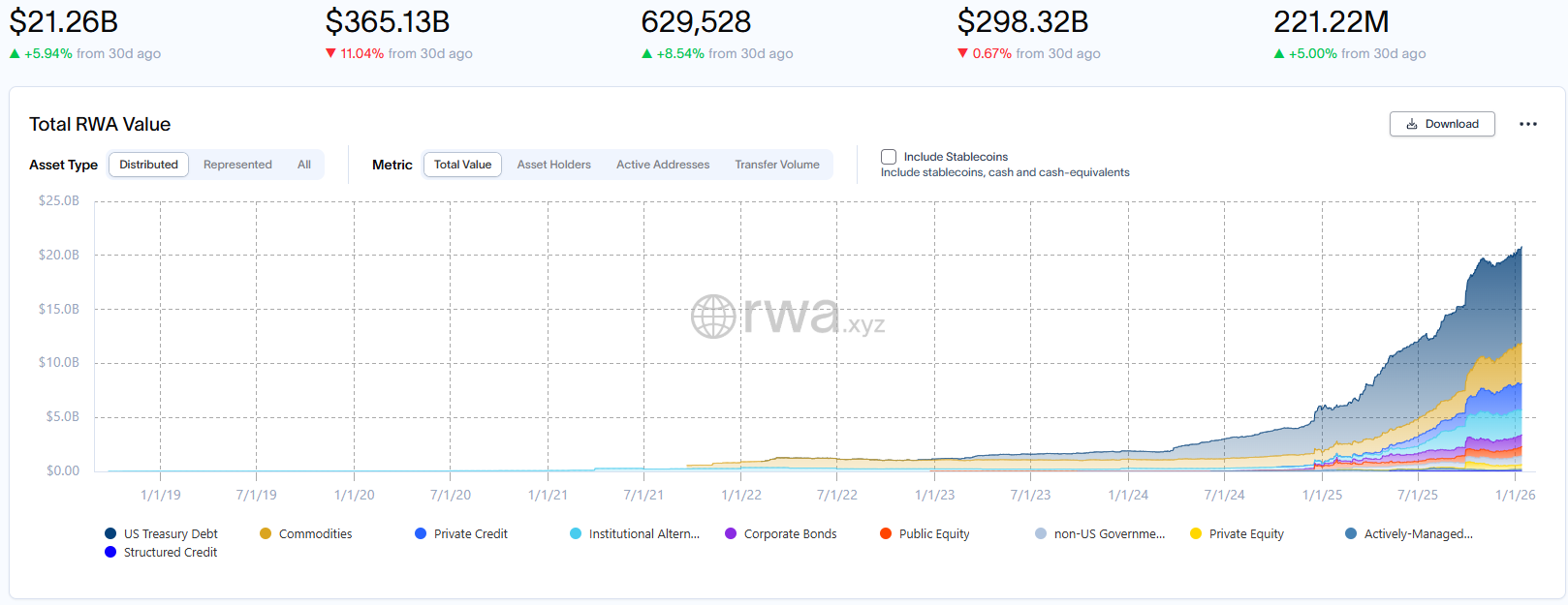 显示,链上现实资产估值已超210亿美元,持有者数量逾62.9万。