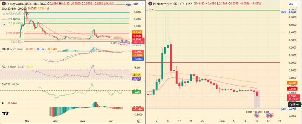 当前PI Network报价0.56美元,日内跌幅13%。但盘中触及的0.39美元低位更值得关注——这一价格不仅刷新历史最低记录,更与四月创下的前低持平。尽管有所反弹,此次暴跌已引发投资者恐慌。