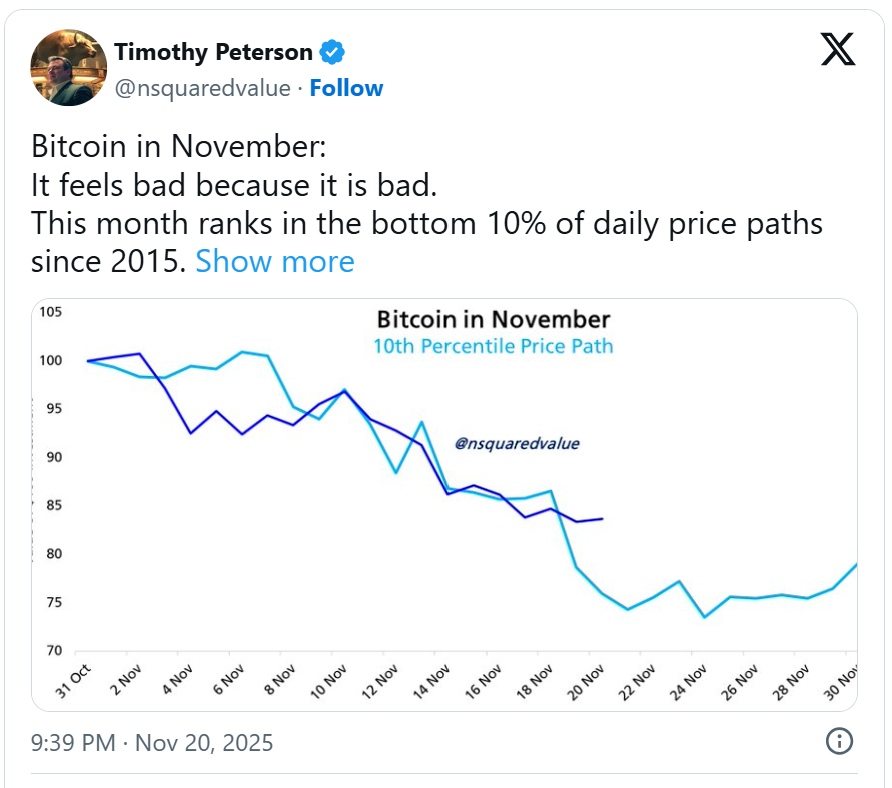 最新比特币研究显示,其当前走势与2022年熊市阶段几乎如出一辙。与此同时,今年11月的价格波动幅度位列2015年以来日跌幅排名的后10%。尽管如此,市场情绪的转变仍可能在年底前引发风险资产的经典"圣诞反弹"行情。