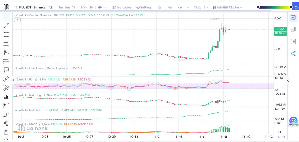 Filecoin刚刚完成了数月来最利落的突破行情。FIL价格从1.26美元附近飙升至3.30美元上方,4小时图清晰展示了这波涨势的力度:连续的长阳烛、MACD指标强势金叉、RSI数值突破80关口。