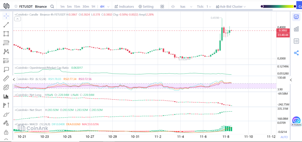 与此同时,FET重新成为交易者关注的焦点。该代币成功突破长期横盘的0.19美元区间,最高触及0.46美元后稳定在0.38美元附近。