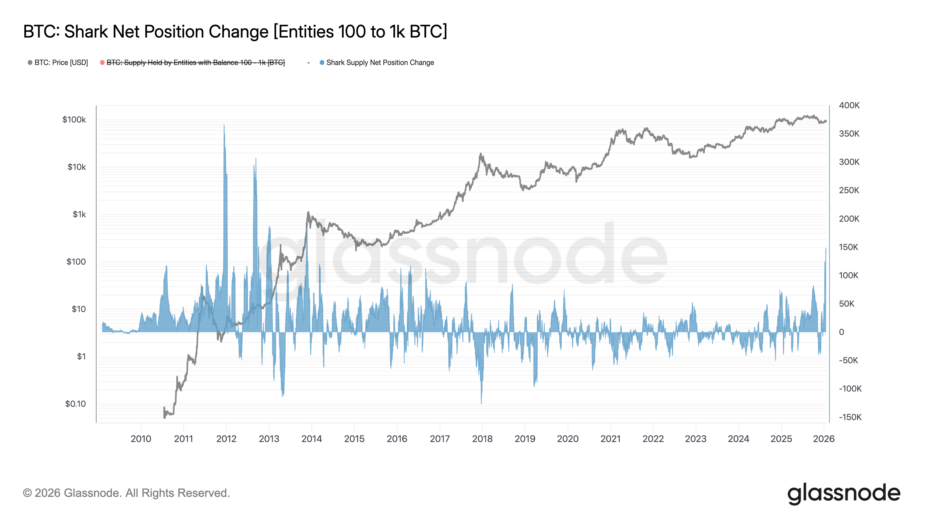 Glassnode数据显示,截至周三,持有100-1000枚比特币的“鲨鱼群体”正以2013年以来最快速度积累比特币。
