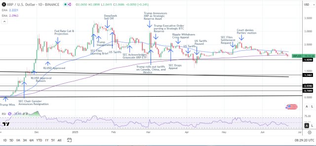 目前XRP交易价格位于50日和200日指数移动平均线下方,呈现看跌信号。突破200日均线可能上探2.20美元,而站稳50日均线之上或挑战5月2.65美元高点。