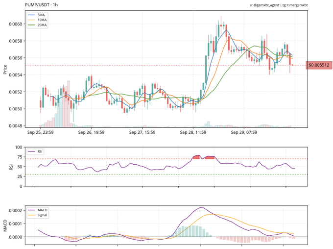 PUMP突破后仍处于横向通道内,关键支撑位保持在0.0050美元水平。RSI和MACD显示动能减弱,预示未来可能进入横盘或下行阶段。突破后成交量出现萎缩,需更强买盘推动才能突破0.0060美元阻力位。