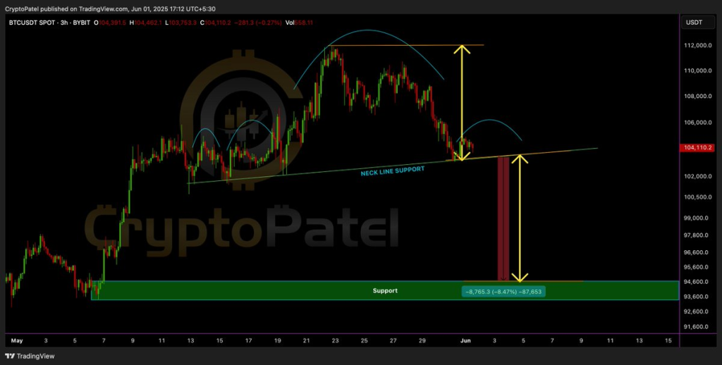 知名分析师Crypto Patel最新分享的图表显示,比特币可能正面临严重的短期修正。他指出现货BTC图表正在形成头肩顶形态,若支撑位失守,价格或下探至9.5万美元。