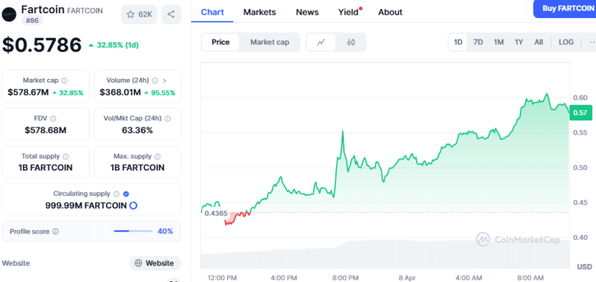 FARTCOIN表现最为抢眼,单日涨幅接近30%,现价达到0.5791美元。其日交易量飙升至3.6686亿美元,较昨日增长92%。不仅价格攀升,其排名也在一夜之间从第91位跃升至第86位。