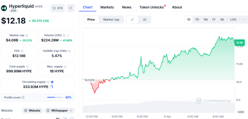 Hyperliquid(HYPE)在过去24小时内上涨17.74%,现价12.06美元。其市值达到40.3亿美元,交易量增长超过40%,达到2.2389亿美元。目前排名第26位,随着市场反弹,其发展势头强劲。