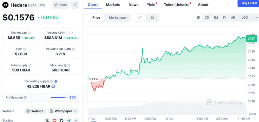 Hedera(HBAR)同样表现不俗,上涨18.28%,现价0.1576美元。目前排名第18位,市值达66.5亿美元。最引人注目的是其日交易量激增93.94%,达到5.8359亿美元。交易者对HBAR的信心依然坚定,今日的上涨就是最好的证明。
