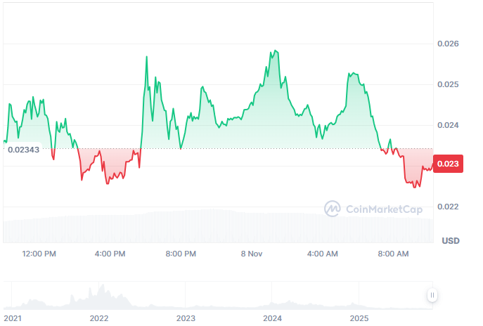 图表中红绿交替的蜡烛图显示多空持续博弈。虽然高点仍在下移,但0.022美元低点的坚守展现韧性。在当前条件下守住该基准位后,短期有望回升至0.025-0.026美元区间。