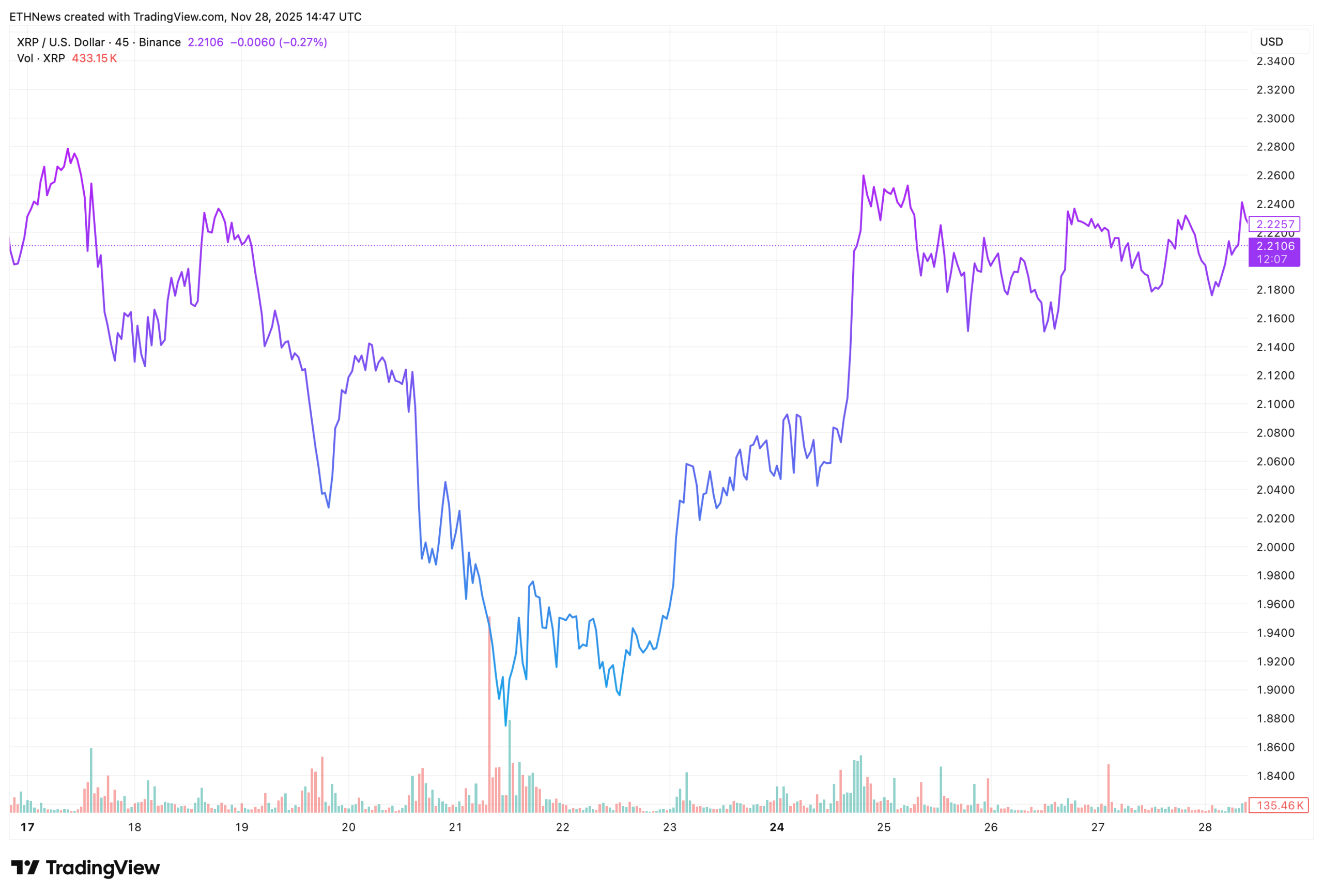 提供的TradingView图表记录了XRP过去十天的剧烈波动。市场在11月17日至21日期间大幅下挫,跌破2.00美元关口并下探1.94美元附近。这波走势符合多周调整阶段末期常见的恐慌性插针特征。