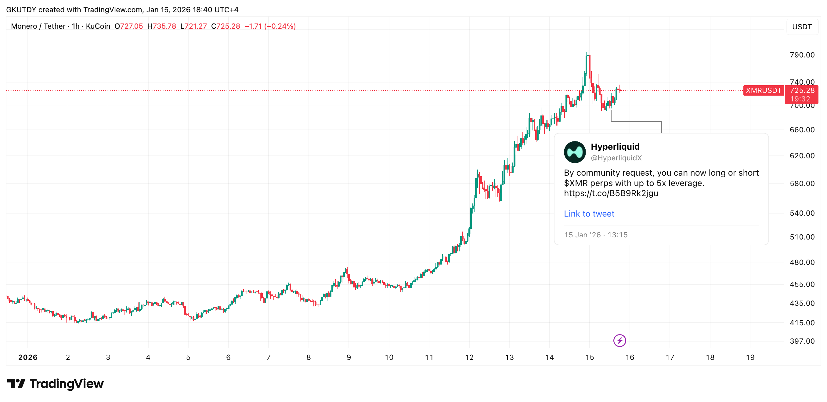 衍生品成为唯一的选择,而交易者正在利用它们。价格走势说明了一切:门罗币本月上涨81.6%,交易价格突破742美元。其市值增速现已超越比特币现金,并逼近卡尔达诺。没有新消息,没有路线图,也没有重大整合。仅仅是市场行为,很可能由隐私币爱好者调仓推动,而市场其他参与者正紧盯ETF和 meme 币。