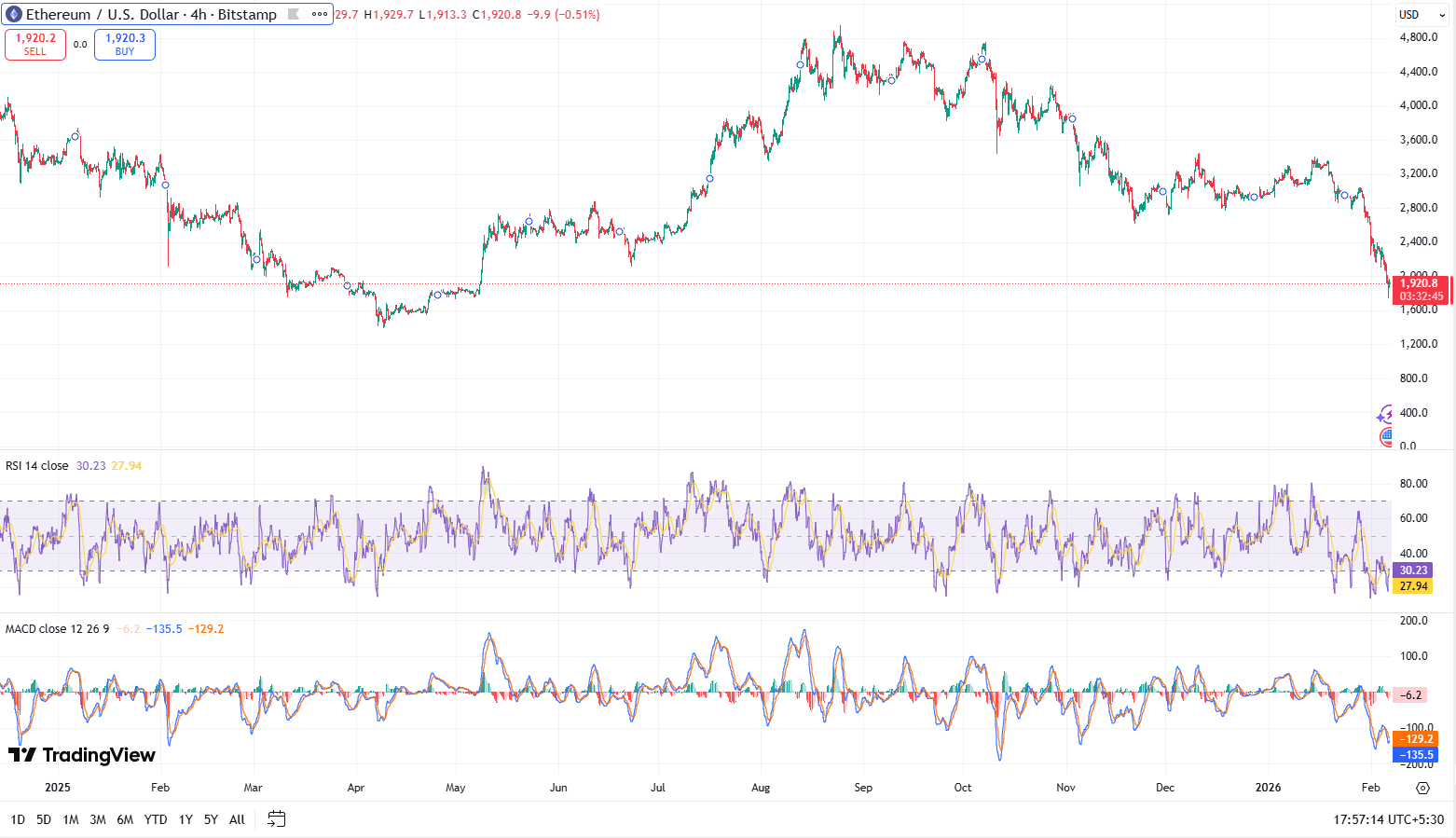 在4小时图上,ETH仍处于明确下跌趋势。价格已跌破2000美元支撑区域,且多次尝试收复未果。