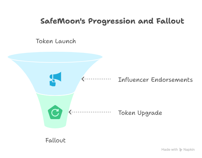 SafeMoon就是个典型例子。2021年底该项目推出V2版本,以1:1000比例合并原代币供应并降低交易费。表面看像是升级,但实际上该代币仍缺乏明确用途,且从未通过正式审计。推动SafeMoon短暂走红的不是技术,而是名人背书。包括Jake Paul、Lil Yachty、Nick Carter、Logan Paul、DJ Afrojack甚至电影制片人Brett Ratner等大腕为项目披上了合法外衣。