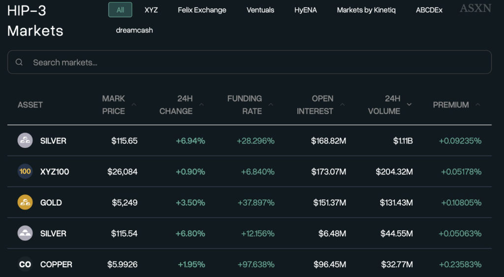 仅一份合约就占据了头寸的大部分,其中xyz贡献了约8.033亿美元。这种集中度表明存在大规模的方向性风险敞口,而非零散的散户参与。其他HIP-3市场,包括HYNA(6490万美元)、FLX(2200万美元)等,也表现出活跃度。这一系列活动强化了资本正在更广泛的HIP-3产品套件中流动、而非追逐单一交易的观点。