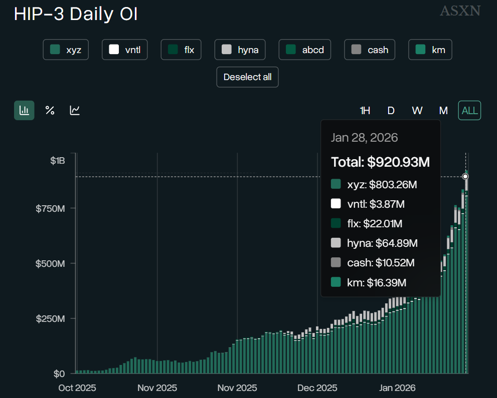 HIP-3市场数据显示,交易者在Hyperliquid上的头寸布局方式发生了决定性的结构性转变。2026年1月28日的最新数据显示,总未平仓合约已攀升至9.209亿美元,标志着自该产品推出以来最强劲的持续增长之一。然而,增长并非均匀分布。