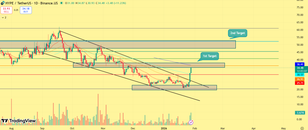 Hyperliquid的图表结构支持看涨前景,因其复制了过去几个交易时段的巨大积累形态。在突破下降通道后,HYPE价格已反弹超过40%,且仍有进一步上行目标。HYPE当前的价格走势复制了一种趋势反转形态,短期移动平均线已开始向上弯曲,暗示结构正在转变。