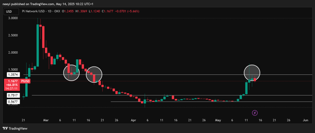 即使在现在,尽管比特币已经连续上涨超过五周,许多山寨币也加入了这波涨势,Pi币却依然落后。它挣扎了三周,直到上周才开始略有上涨,交易价格在0.56美元至0.75美元之间。截至撰写本文时,PI价格约为1.17美元,仍未能突破1.35美元的强劲阻力位,该阻力位已多次未能突破。