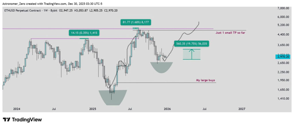 尽管加密货币市场持续笼罩在熊市氛围中,以太坊($ETH)仍展现出惊人的韧性。虽然面临挑战且市场参与度有所下降,$ETH 价格始终坚守关键支撑位。值得注意的是,以太坊已连续六周维持周线低点,这预示着该代币可能正在酝酿一轮看涨突破。分析师 Astronomer Zero 指出,$ETH 的技术结构表明其可能很快会升至 5000 美元,尽管整体市场环境仍偏向看跌。