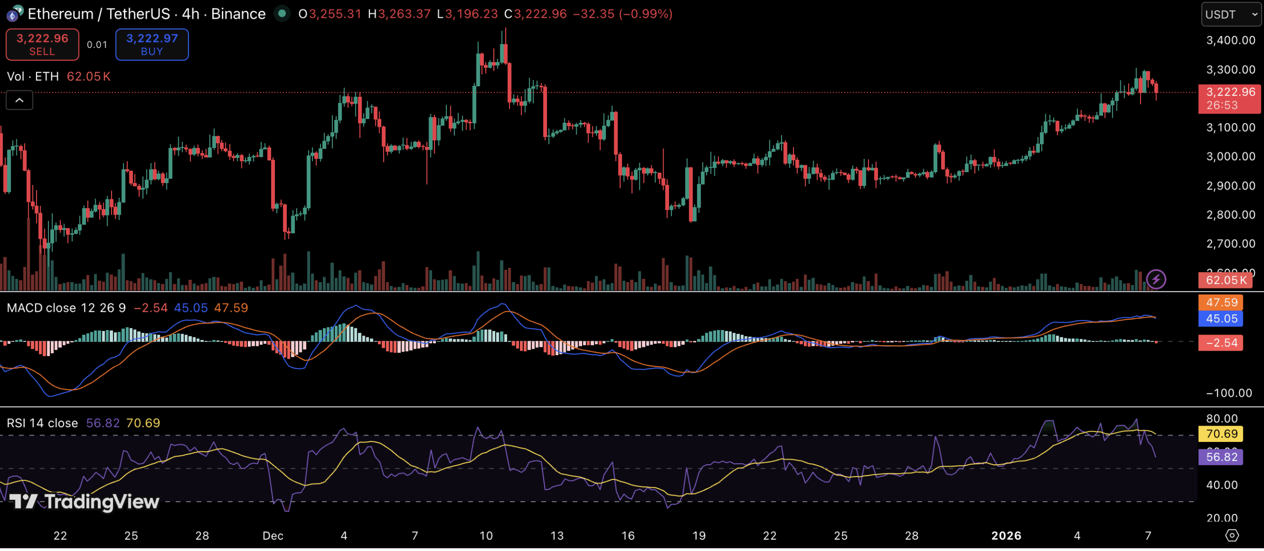 以太坊的市场表现与申请提交时机高度契合。ETH交易价格维持在3200美元区域附近,此前已从12月低点实现了强劲的数周反弹。4小时图上的最新回调呈现技术性修正特征,价格在快速上攻3300美元区域后进入整固阶段。动量指标显示混合但建设性的信号:RSI近期进入超买区域后降温,表明尽管短期动能耗尽,买家仍掌控局势;MACD虽趋于平缓,但相较前期整固阶段仍处于高位,显示看涨动能尚未完全消退。