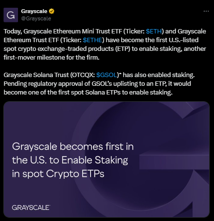 灰度表示将采用机构级托管服务和多元化验证节点组合,该设计旨在降低单点故障风险并增强运营韧性。公司还在等待转换为ETF的Solana信托中启用质押功能。若监管机构批准转换,未来产品中的SOL持有者或可在相同框架下获得类似链上收益。