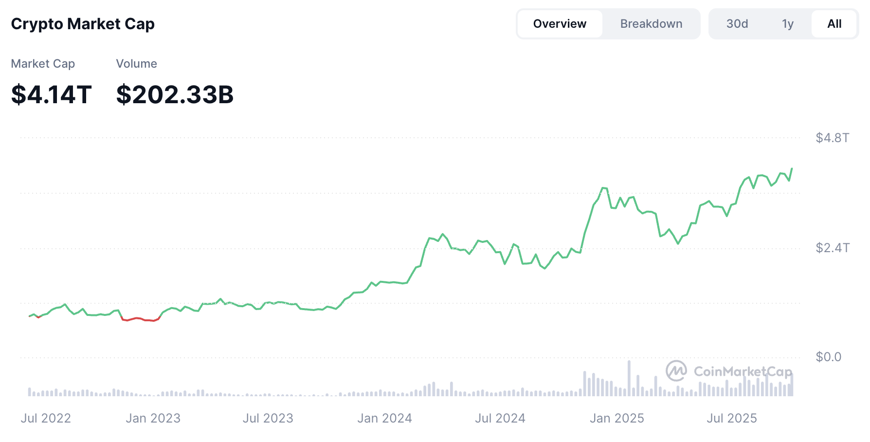 今年以来,比特币与市值前20的山寨币主导着加密货币市场。目前总市值已突破约4万亿美元,较2024年底实现显著增长。其中绝大部分涨幅来自比特币、以太坊、索拉纳、