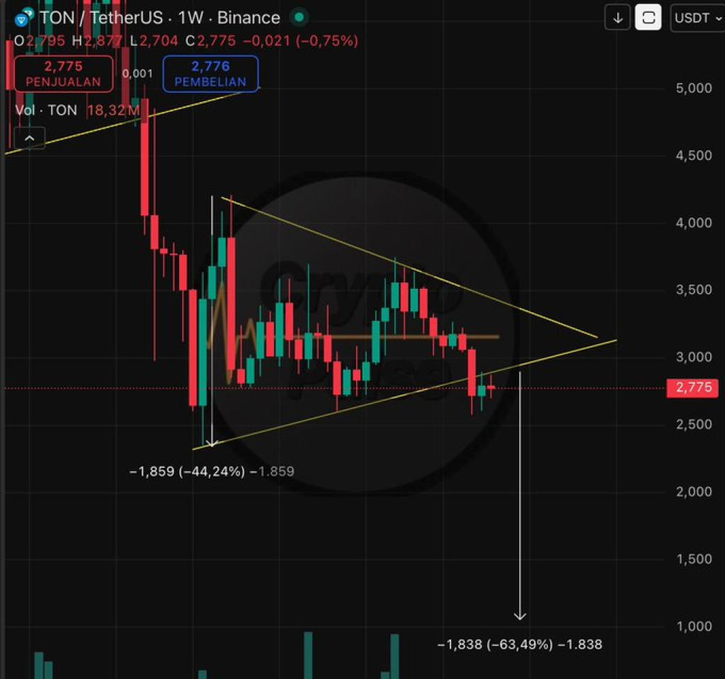Toncoin的走势图表近期引发交易者密切关注,但并非出于看涨原因。周线结构显示,自今年3月以来,TON价格始终困于一个大型对称三角形区间内,而最新走势似乎已明确跌破该支撑线。这令分析师开始质疑,该代币是否正在酝酿更深度的回调。截至撰稿时,TON交易价格约为2.67美元,周跌幅轻微。