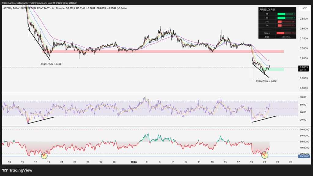 当前下跌模式与去年12月的走势高度相似:当时ASTER从0.85美元跌至0.65美元后强势反弹。彼时RSI同样进入超卖区域,随后伴随价格企稳快速回升。
