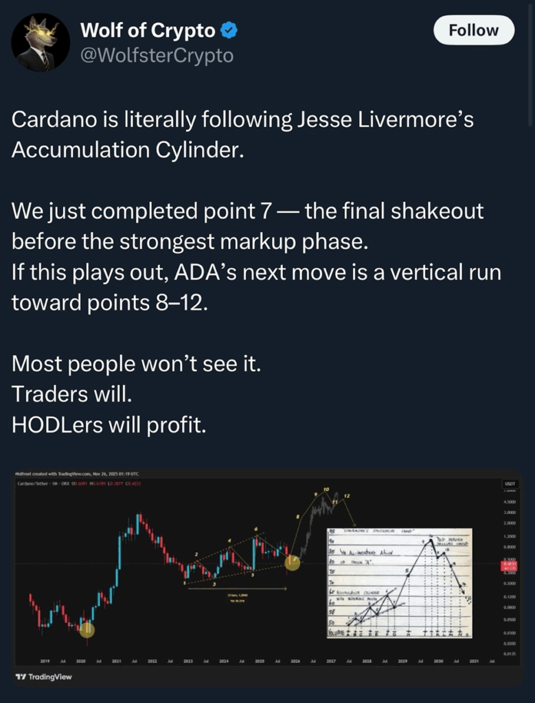 部分分析师仍持乐观态度,指出长达数月的吸筹结构等长期形态依然有效。但这些观点与当前日线结构并不吻合。除非ADA重新站稳0.43美元,否则看跌旗形的破位信号将持续有效。