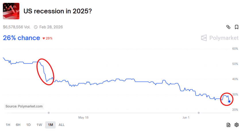 随着激进贸易政策的缓和,美国2025年陷入经济衰退的概率已从2025年5月6日记录的56%大幅降至当前的26%。这一显著变化反映出全球市场的积极情绪。