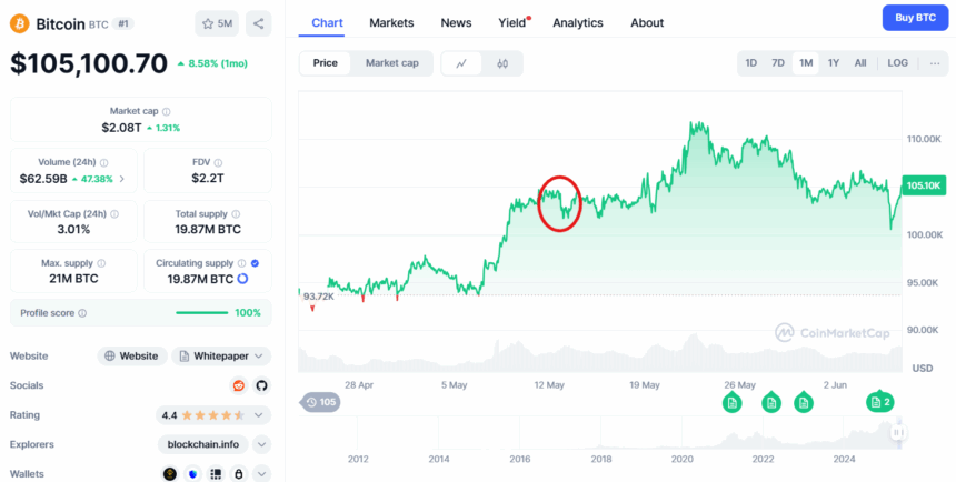 过去21小时内,比特币价格已从印度标准时间凌晨2:30的100,550美元攀升至105,106美元。这种模式转变预示着加密市场可能进入多空博弈阶段。