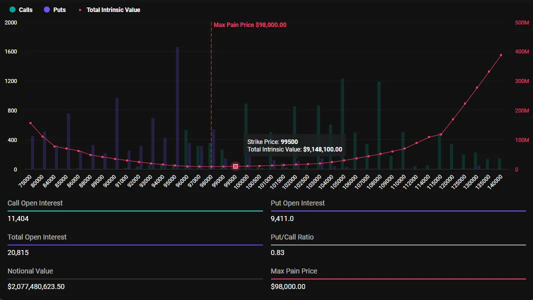 Deribit报告显示,今天将有20,815份比特币合约到期,名义价值达20.77亿美元。看跌看涨比率为0.83,表明交易者继续卖出更多的看涨合约(多头合约)而非看跌合约(空头合约)。最大痛点价格为98,000美元,值得注意的是,这一价格略低于当前现货市场价格。
