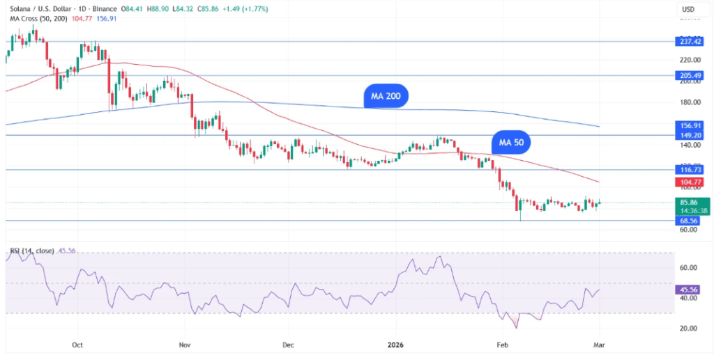 Solana扭转了持续两日的跌势,此前价格在2月28日被推低至77.13美元。反弹将代币价格推升至接近89美元,随后略有回落。重要的是,分析师目前关注105美元水平,这与日线50日移动平均线重合。