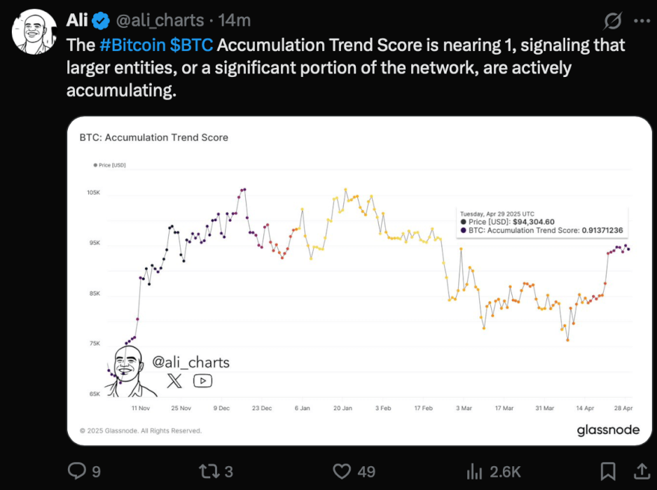 Glassnode追踪的这一指标表明,当前正在进行强劲的积累,通常被解读为看涨的信号。截至4月29日,比特币价格为94,304美元,而积累趋势得分为0.9137。