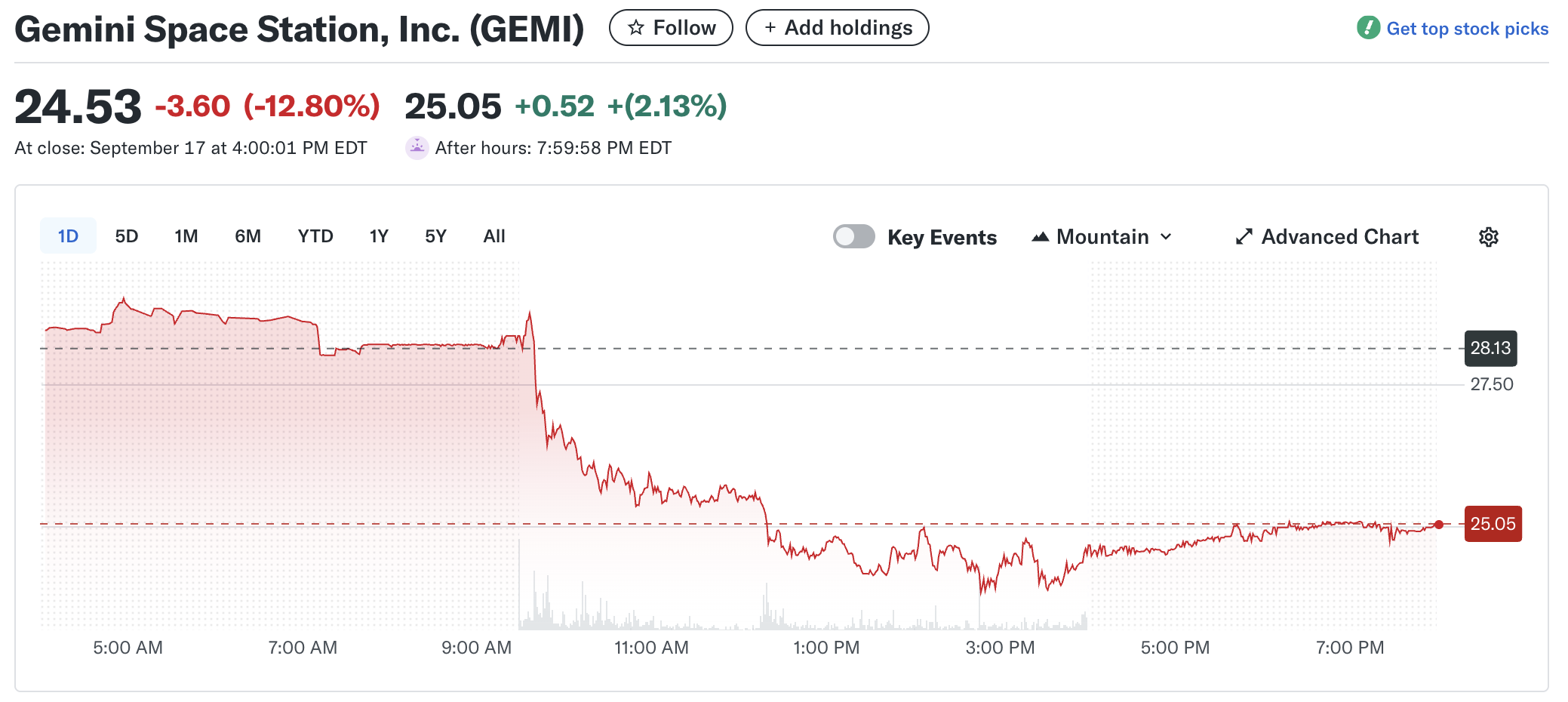 Gemini于9月12日开始交易,在经历短暂上涨后股价便开始下行趋势。截至周三收盘,该股暴跌12.8%至24.53美元。根据雅虎财经数据,盘后交易小幅回升2.1%。该公司当前市值约为29亿美元。