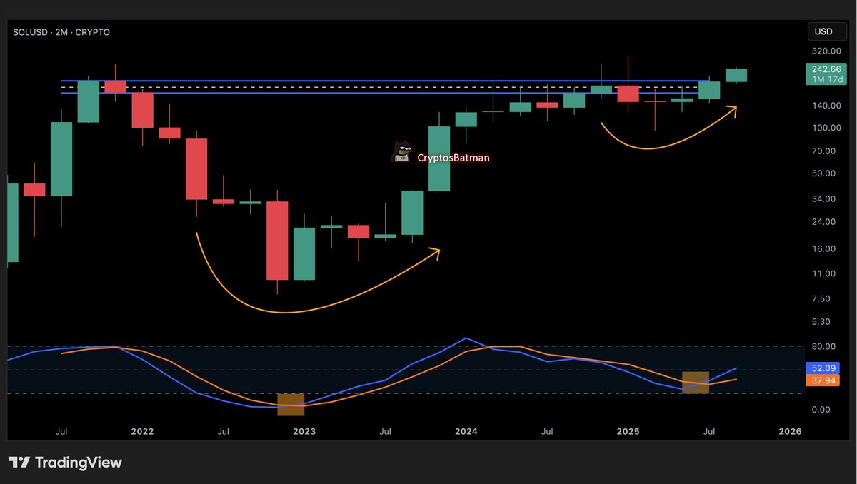 值得注意的是,同一图表上的随机RSI指标也出现金叉(%K线上穿%D线),这是两个月周期内第二次出现该信号。上次发生时SOL报价14美元,随后强势上涨至250美元附近。