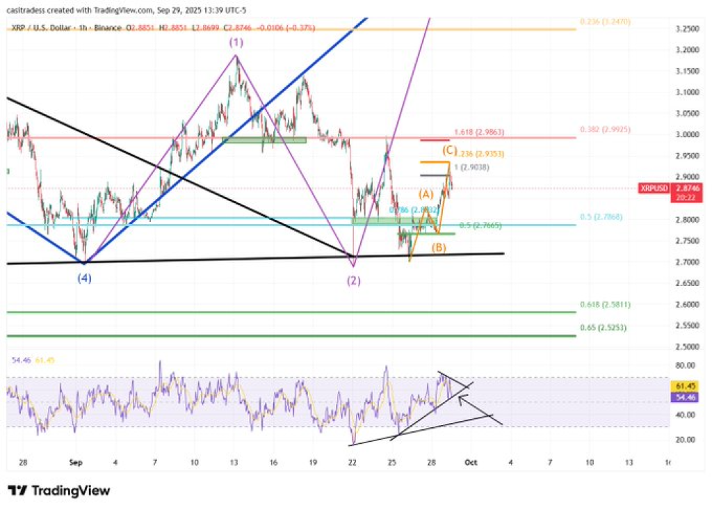 在1小时RSI指标上,XRP价格正在测试支撑趋势线。若能守住,仍可能出现反弹。但如果向下突破,则意味着在更大规模上涨前可能需要经历更多下行测试。