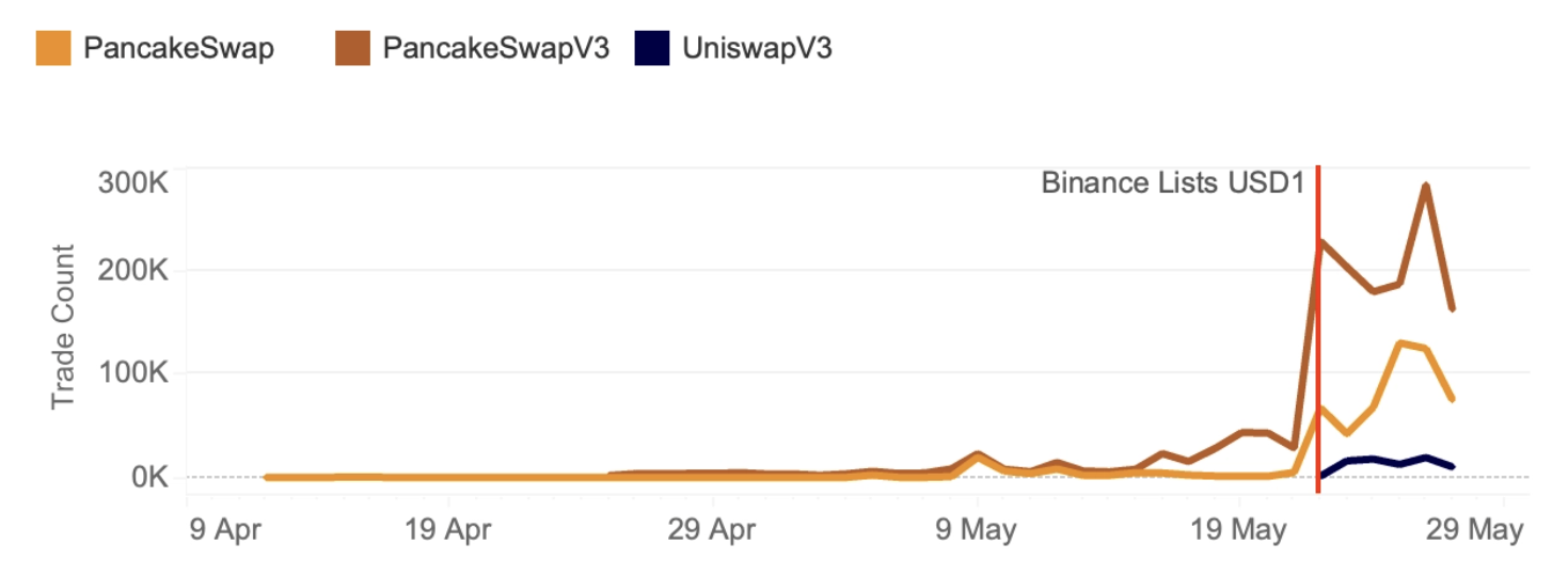 虽然五月底已在币安完成上线,但其完整影响力并未立即显现。不过Kaiko最新数据显示,USD1近期交易量呈现显著攀升:
