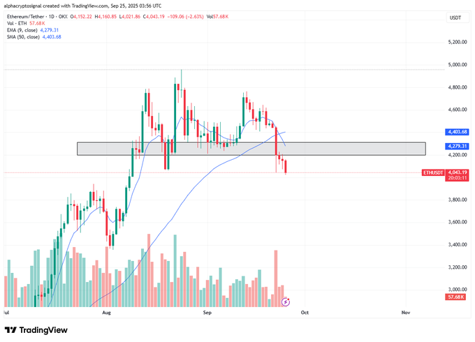 Alpha Crypto Signal在X平台指出,以太坊既未能收复失守的支撑位,现价更回落至4,050美元附近。每次对该区域的测试都引发新的抛售,确认此次破位是有效突破而非短暂诱空。