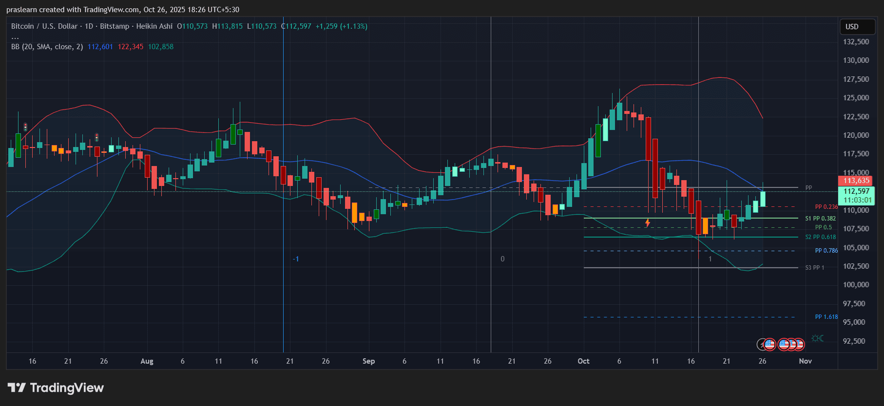 日线图上,比特币正从十月低点悄然回升,现报112,600美元,日内涨幅1.1%。Heikin Ashi蜡烛图显示,在一系列更高的低点后,看涨动能正在稳步积累。布林带持续收窄,通常预示突破行情将至。