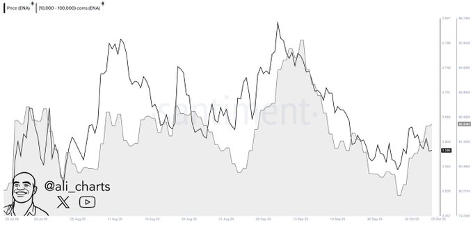 分析师Ali(@ali_charts)最新数据显示,过去一周鲸鱼已累计吸纳280万枚ENA代币。增持行为主要集中在持仓量1万至10万美元的中型机构参与者,暗示其协同进场意图。