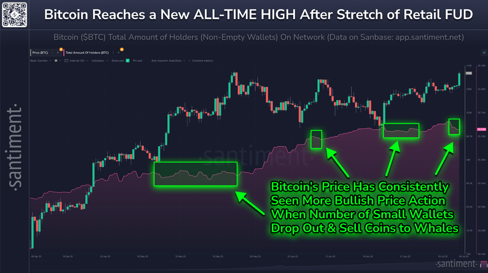 这些强制平仓(主要来自散户)揭示了市场即使在价格突破期仍保持高度波动。然而链上分析机构Santiment指出更深层趋势——散户正在投降。数据显示,持有少量比特币的钱包正在向鲸鱼抛售,这种行为模式在历史上往往预示着暴涨行情。