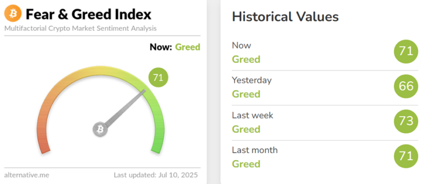 尽管如此,加密论坛和社交媒体情绪仍显谨慎。加密恐惧与贪婪指数虽开始向贪婪倾斜,但尚未达到狂热水平。